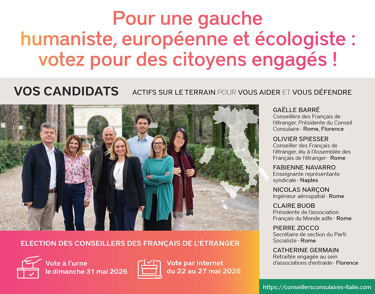 Nous vous présentons la liste « Solidaires à vos côtés » pour les Français d’Italie, du Vatican et de Malte, portée par des élus d’expérience et des citoyens engagés. Nos candidats sont une représentation forte, humaine et réactive au service de notre communauté française.